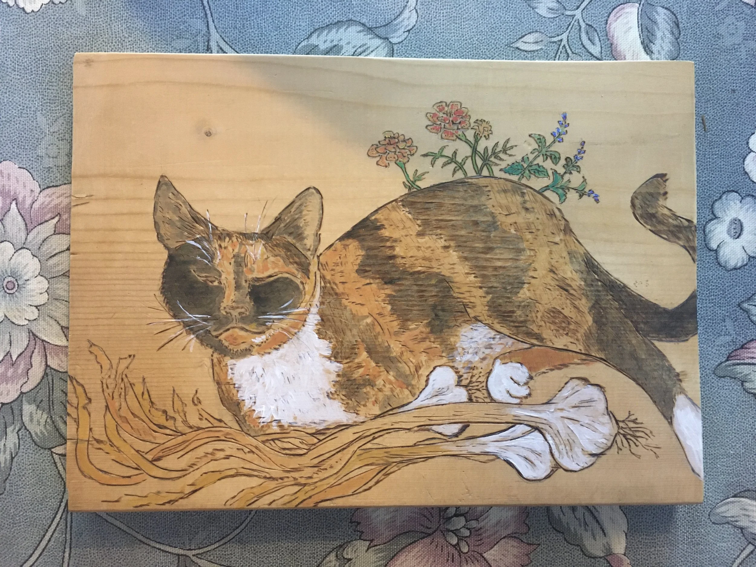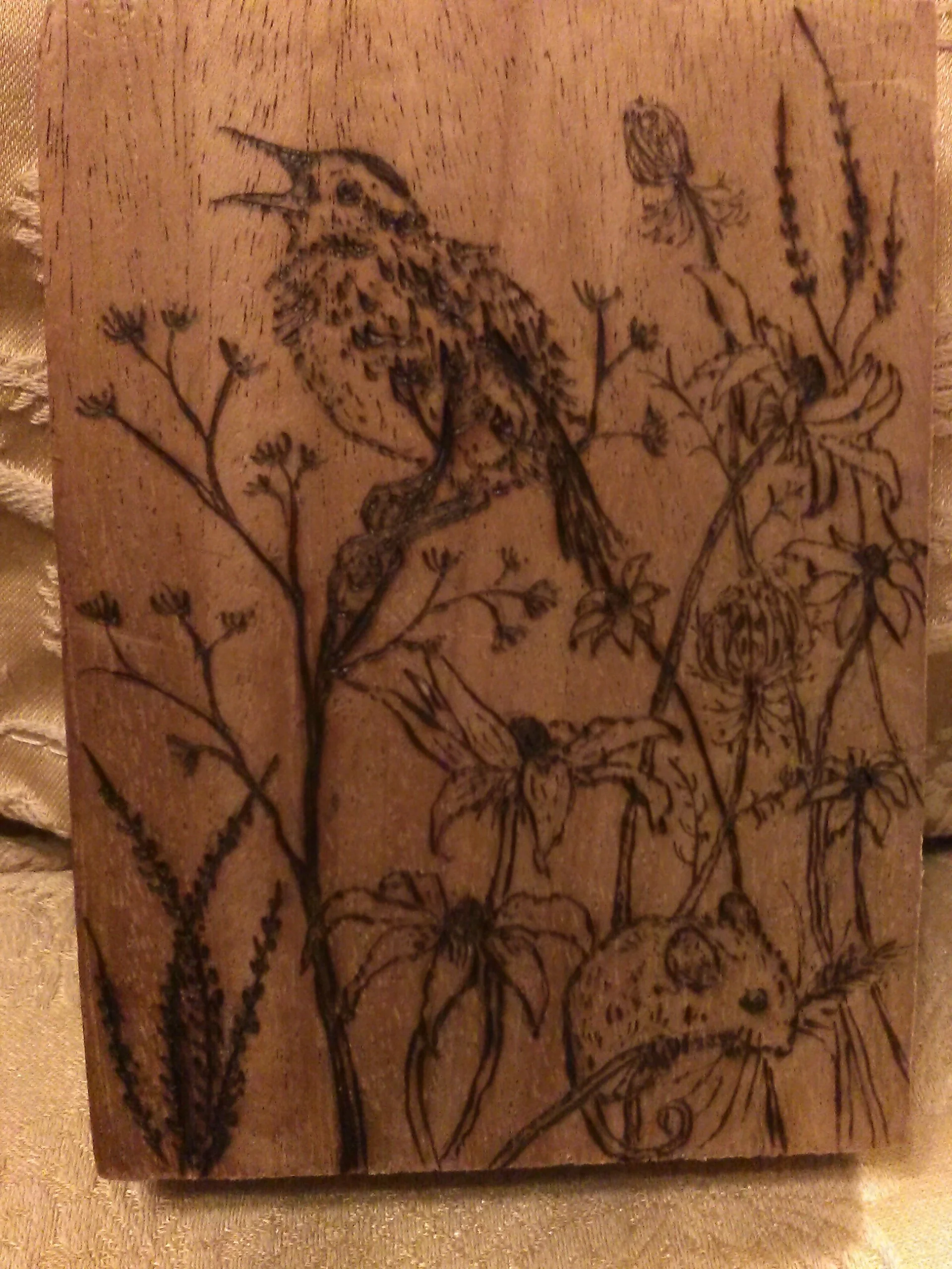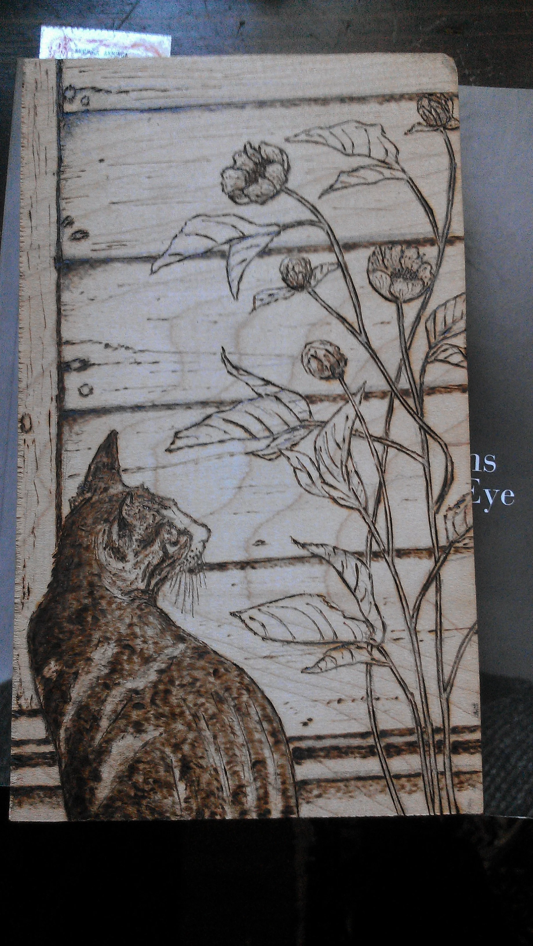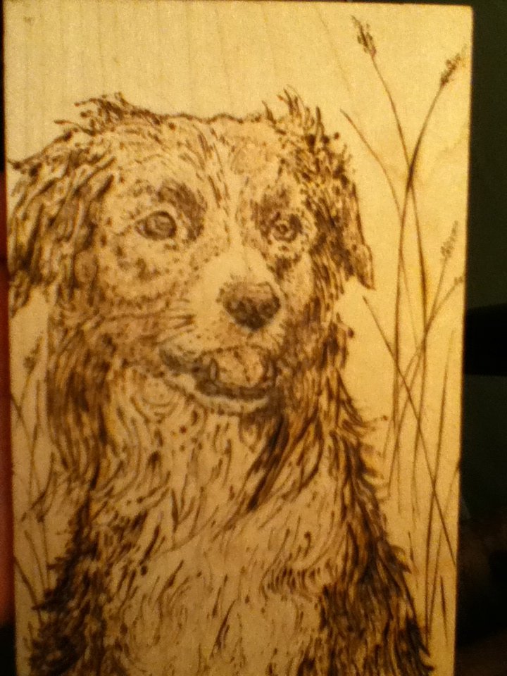 Art Offerings: Woodburnings of plants and animals, including pet portraits and memorials; wooden spoons; candles; copper, shell and stone jewelry; murals; and printmaking