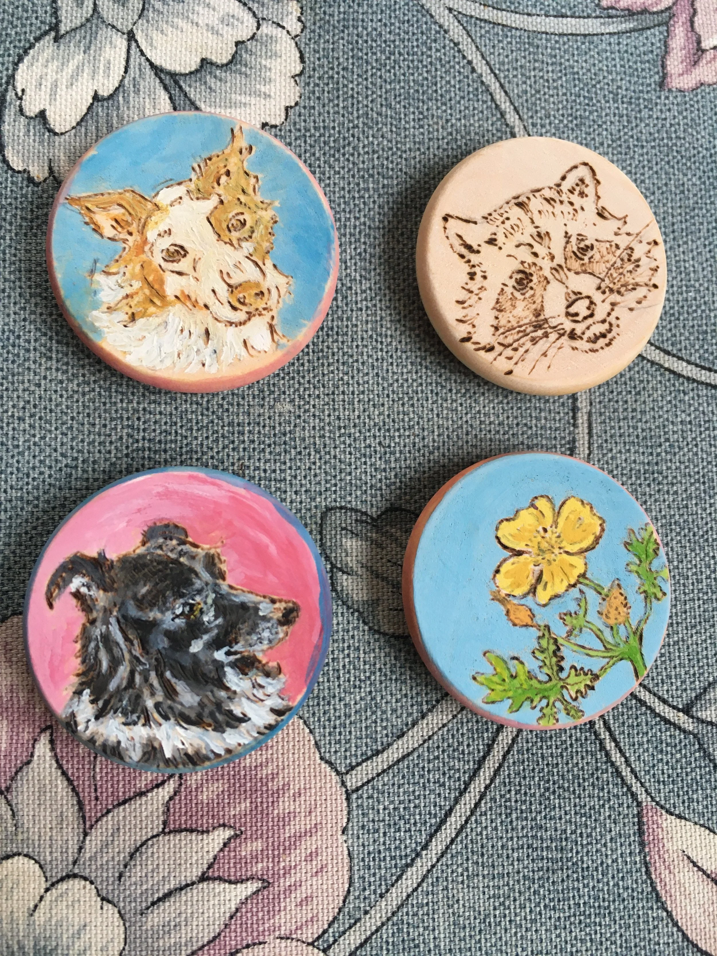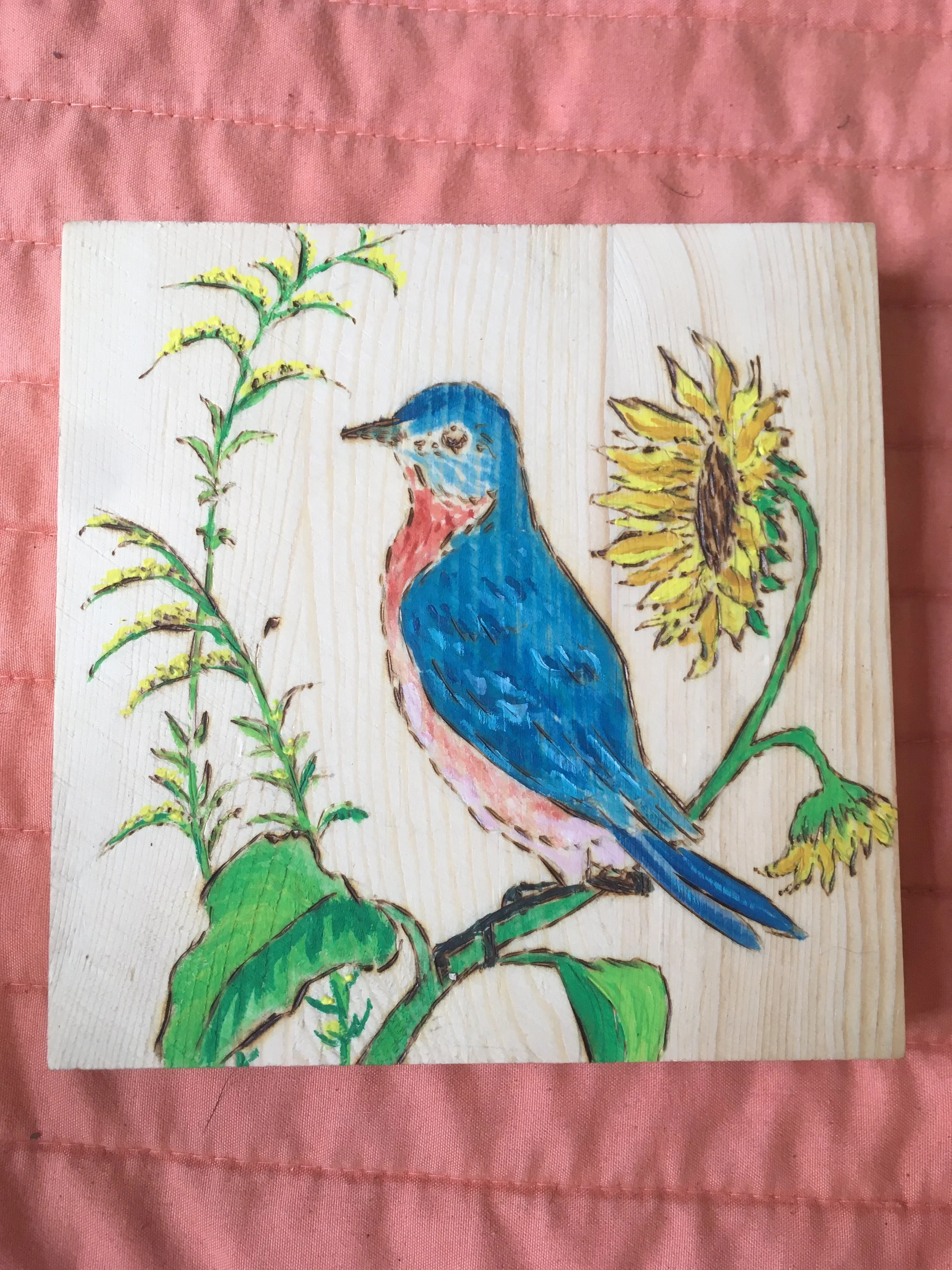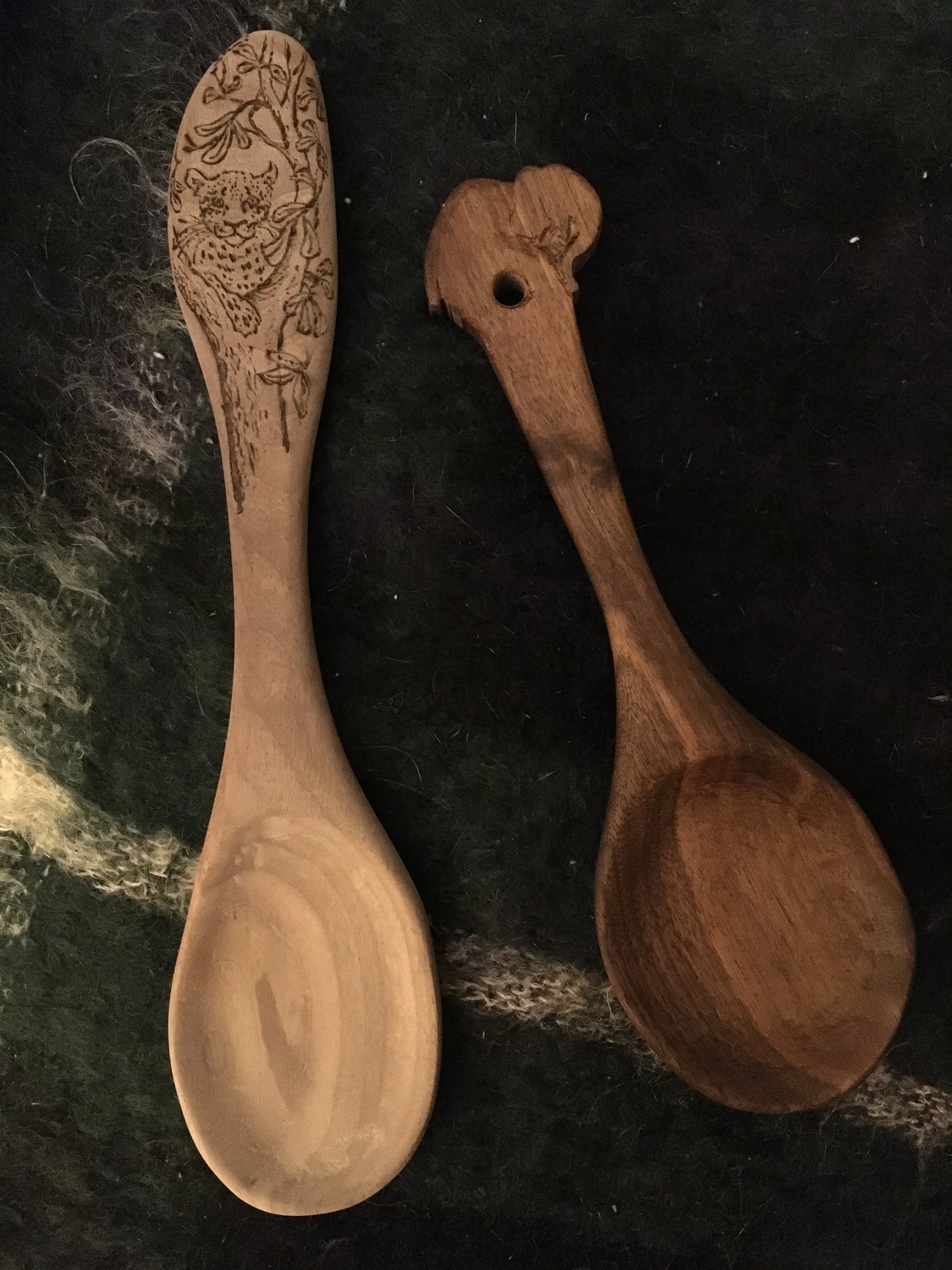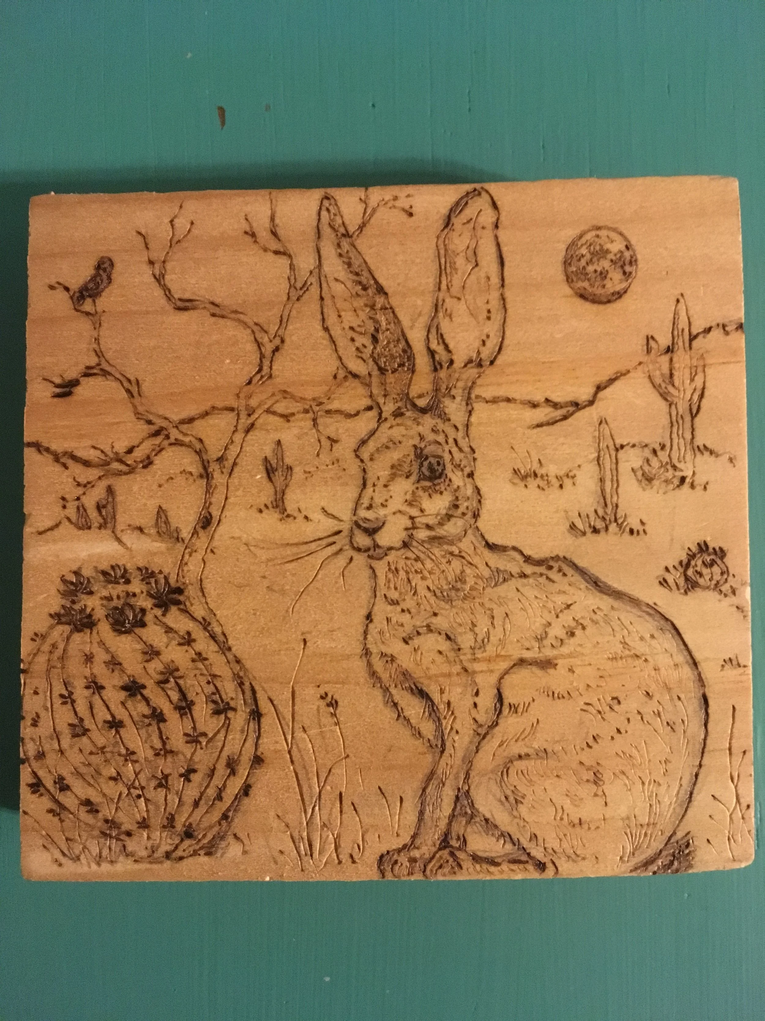 Art Offerings: Woodburnings of plants and animals, including pet portraits and memorials; wooden spoons; candles; copper, shell and stone jewelry; murals; and printmaking